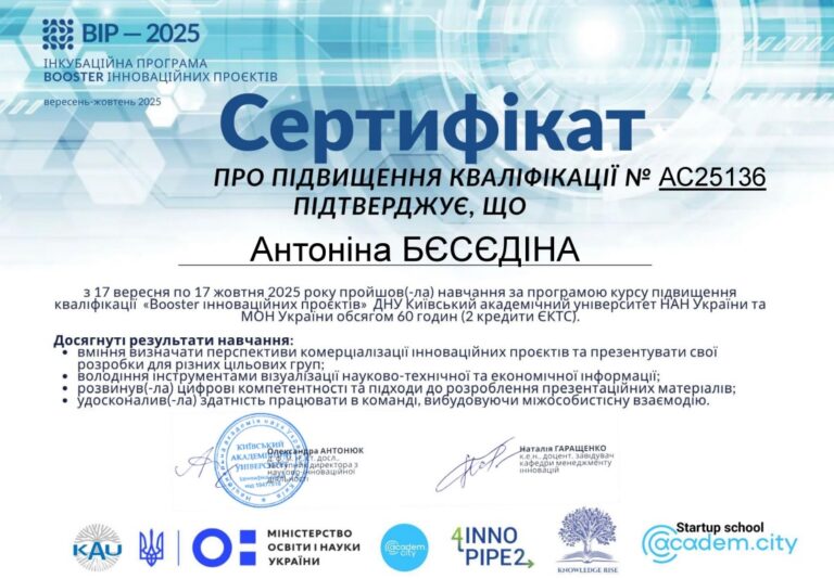 Упродовж місяця, з 17 вересня по 17 жовтня, на базі ДНУ Київського академічного університету НАН України та МОН України проходила програма «Booster інноваційних проєктів 2025», у якій взяла активну участь доцентка Антоніна БЄСЄДІНА.