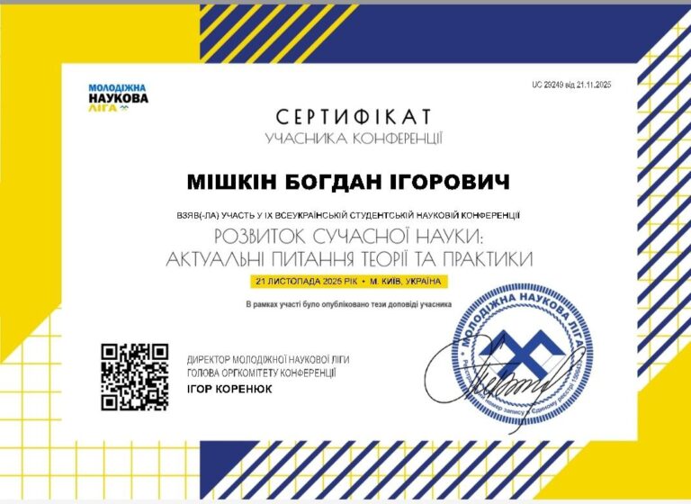 On November 21, 2025, in Kyiv, Ukraine, the IX All-Ukrainian Multidisciplinary Student Scientific Conference “Development of Modern Science: Current Issues of Theory and Practice” took place.