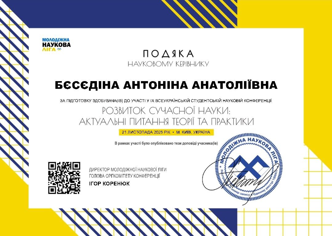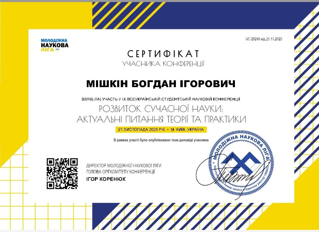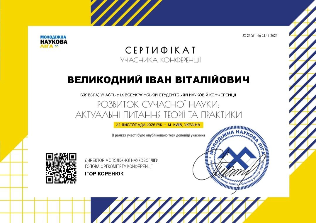 On November 21, 2025, in Kyiv, Ukraine, the IX All-Ukrainian Multidisciplinary Student Scientific Conference “Development of Modern Science: Current Issues of Theory and Practice” took place.