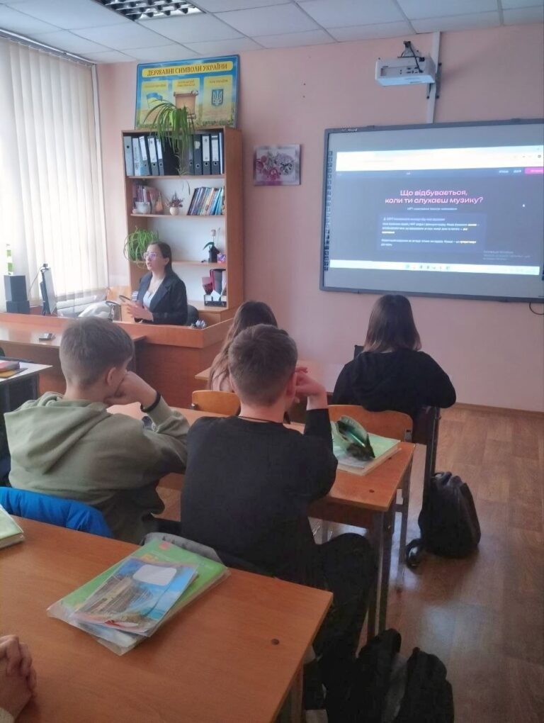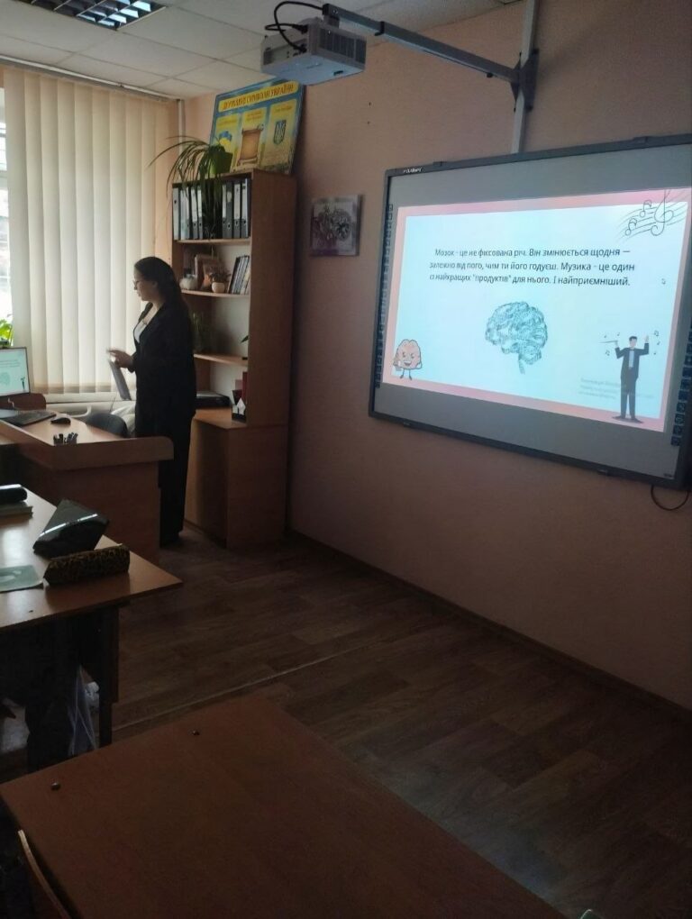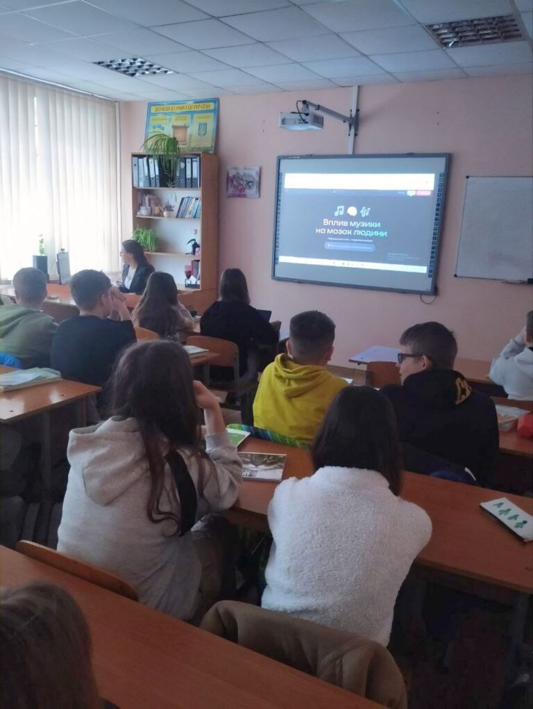 On March 20, the final event of Brain Awareness Week 2026 took place, organized by student Olha Chernysh (MC.m-215 group) within the premises of Municipal Institution Lyceum No. 33 of the Sumy City Council. It was an engaging and educational discussion titled “How Does Music Affect Brain Function?”, held for students of classes 7-A and 7-B and aimed at supporting one of the Sustainable Development Goals proclaimed by the United Nations — “Good Health and Well-being.”