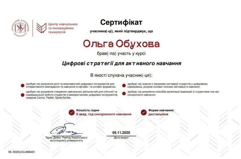 On November 5, 2025, lecturer Olha Obukhova successfully completed the course “Digital Strategies for Active Learning”, organized by the Center for Teaching and Learning Innovations of the Ukrainian Catholic University. The training took place from October 8 to November 5, 2025, in an online format and included 8 academic hours of synchronous learning.