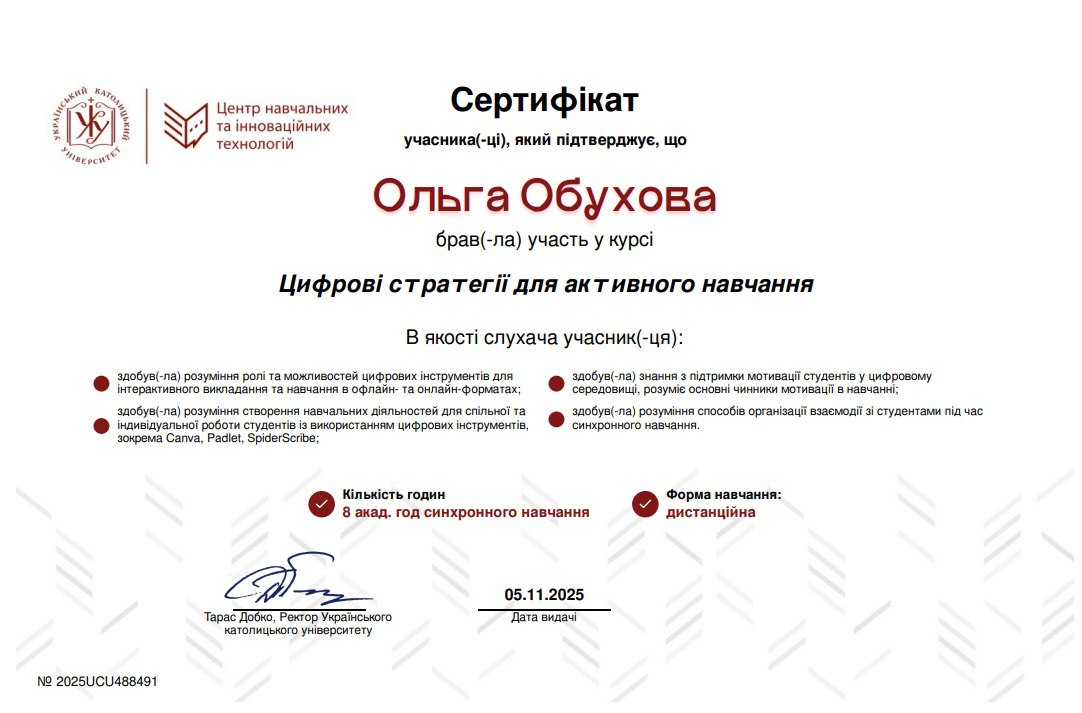 On November 5, 2025, lecturer Olha Obukhova successfully completed the course “Digital Strategies for Active Learning”, organized by the Center for Teaching and Learning Innovations of the Ukrainian Catholic University. The training took place from October 8 to November 5, 2025, in an online format and included 8 academic hours of synchronous learning.