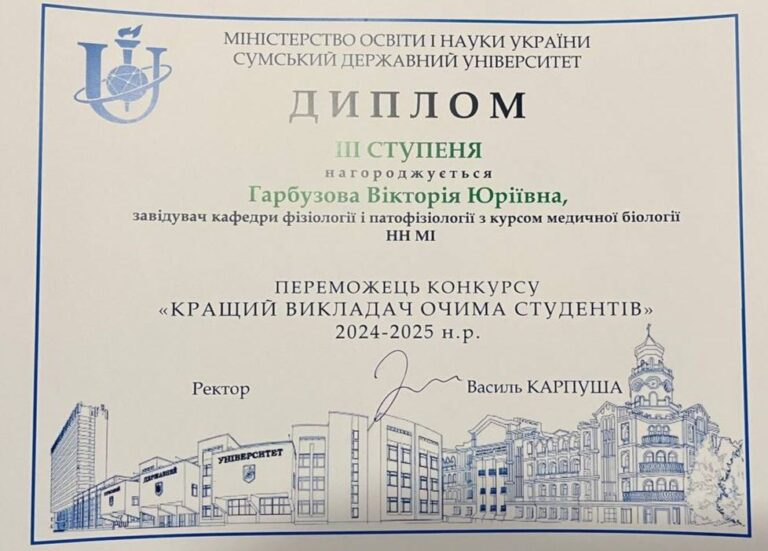 The staff of the Department of Physiology and Pathophysiology with a Course in Medical Biology congratulate the Head of the Department, Professor Viktoriia Yuriivna Harbuzova (3rd degree diploma), Associate Professor Olha Anatoliivna Obukhova (2nd degree diploma), and Assistant Zoia Mykhailivna Levchenko (2nd degree diploma) on winning the competition “Best Teacher in the Eyes of Students” based on the results of the 2024–2025 academic year.