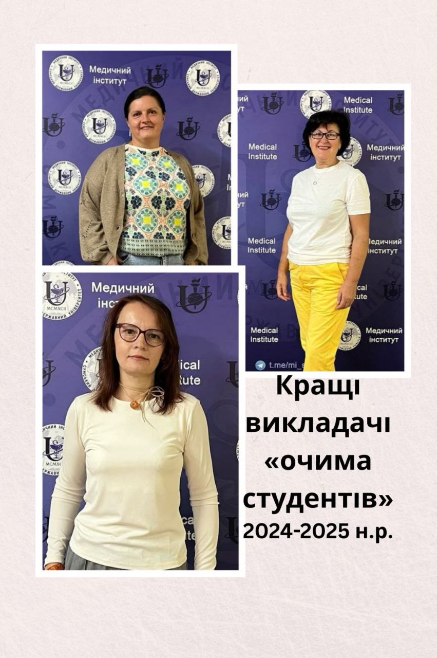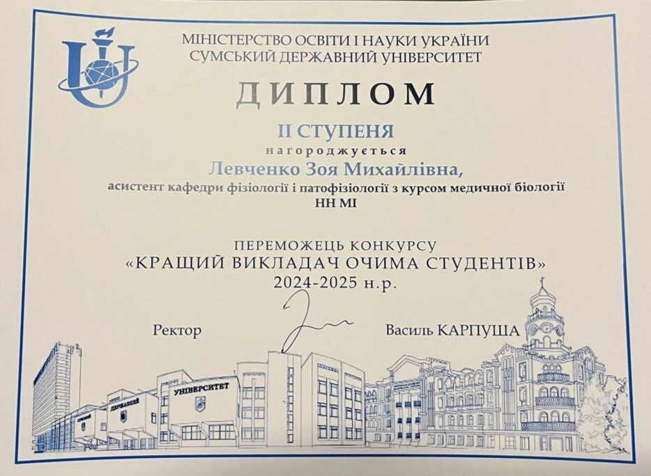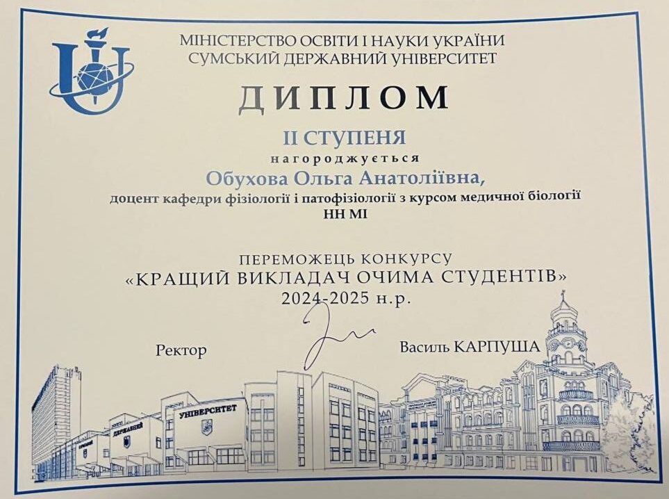 The staff of the Department of Physiology and Pathophysiology with a Course in Medical Biology congratulate the Head of the Department, Professor Viktoriia Yuriivna Harbuzova (3rd degree diploma), Associate Professor Olha Anatoliivna Obukhova (2nd degree diploma), and Assistant Zoia Mykhailivna Levchenko (2nd degree diploma) on winning the competition “Best Teacher in the Eyes of Students” based on the results of the 2024–2025 academic year.