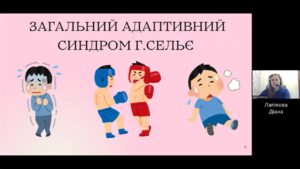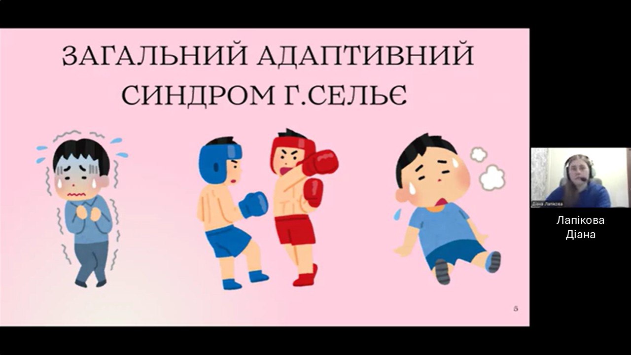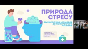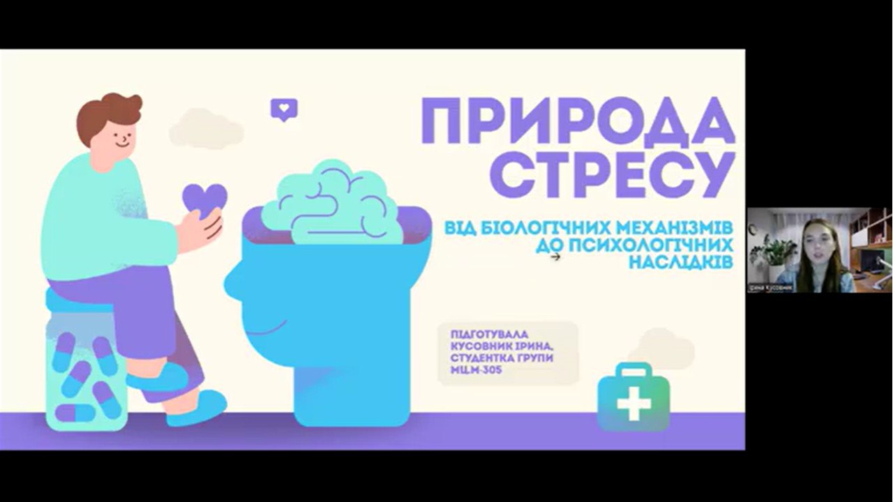 - Presentation by Iryna Kusovnyk, a third-year student of group Мц.-305, “The Nature of Stress: From Biological Mechanisms to Psychological Consequences.”It was interesting to learn about the physiological aspects of stress, Hans Selye’s theory, the stages of stress development, the role of hormones in regulating stressful situations, as well as the psychological consequences of stress.