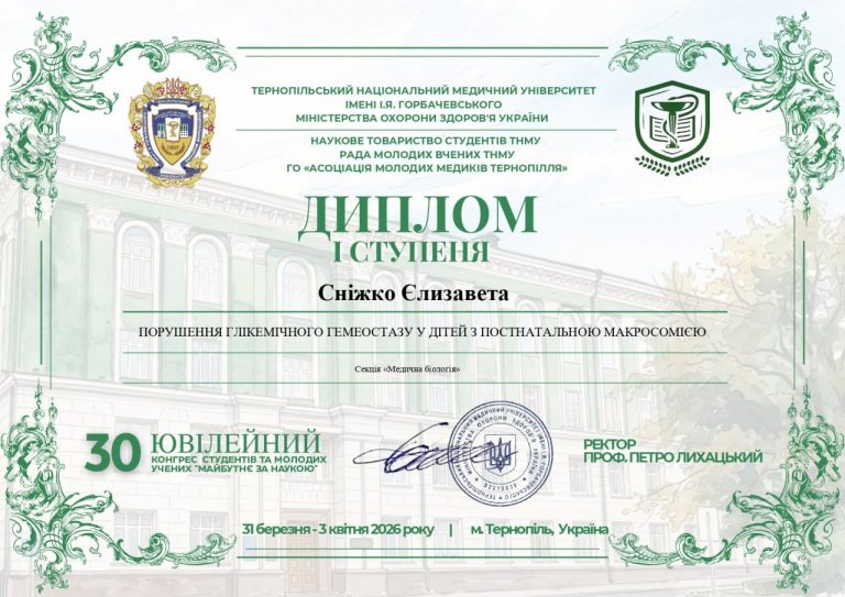 From March 31 to April 3, 2026, first-year student Yelyzaveta Snizhko (group MC-505) participated in the 30th Anniversary Congress of Students and Young Scientists “The Future Belongs to Science,” organized by the Student Scientific Society and the Council of Young Scientists of I. Horbachevsky Ternopil National Medical University of the Ministry of Health of Ukraine in cooperation with the NGO “Association of Young Medical Professionals of Ternopil.”