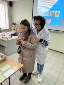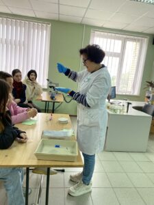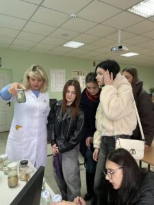 Антоніна БЄСЄДІНА ознайомила присутніх з історією кафедри, навчальними дисциплінами, науковими дослідженнями та роботою наукових гуртків кафедри. Цікавим було спілкування у класі-музеї з медичної біології, де студенти мали можливість бачити багато цікавих експонатів, задавати запитання.