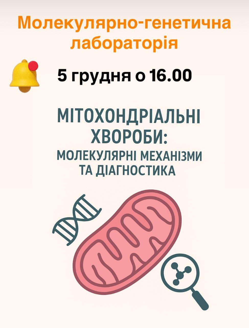 Запрошуємо студентів та всіх охочих взяти участь у засіданні гуртка, присвяченому актуальним питанням молекулярної генетики та медицини. У рамках заходу будуть представлені доповіді, що висвітлюють сучасні уявлення про причини, діагностику та лікування мітохондріальних захворювань.