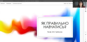 У другій частині засідання Вікторія Гарбузова провела вебінар на тему «Як правильно навчатись?», у якому познайомила учасників із сучасними нейробіологічними основами роботи мозку людини, явищами нейропластичносиі та нейрогенезу, надала практичні поради по організації процесу навчання для ефективного набуття знань.