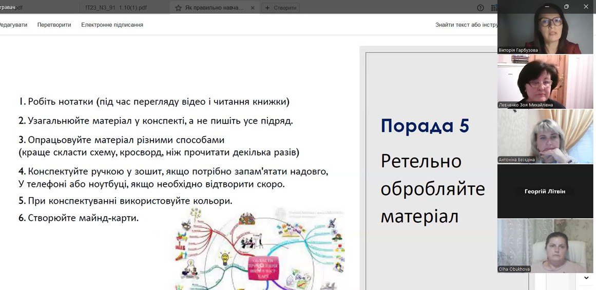 У другій частині засідання Вікторія Гарбузова провела вебінар на тему «Як правильно навчатись?», у якому познайомила учасників із сучасними нейробіологічними основами роботи мозку людини, явищами нейропластичносиі та нейрогенезу, надала практичні поради по організації процесу навчання для ефективного набуття знань.